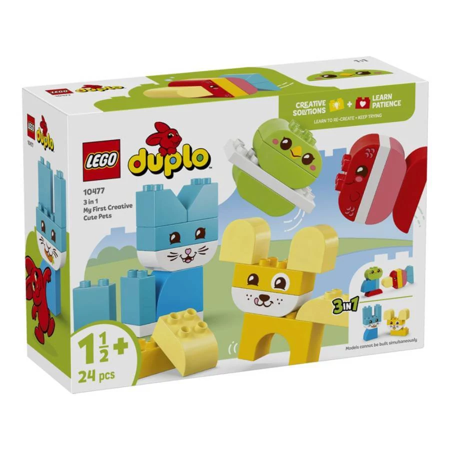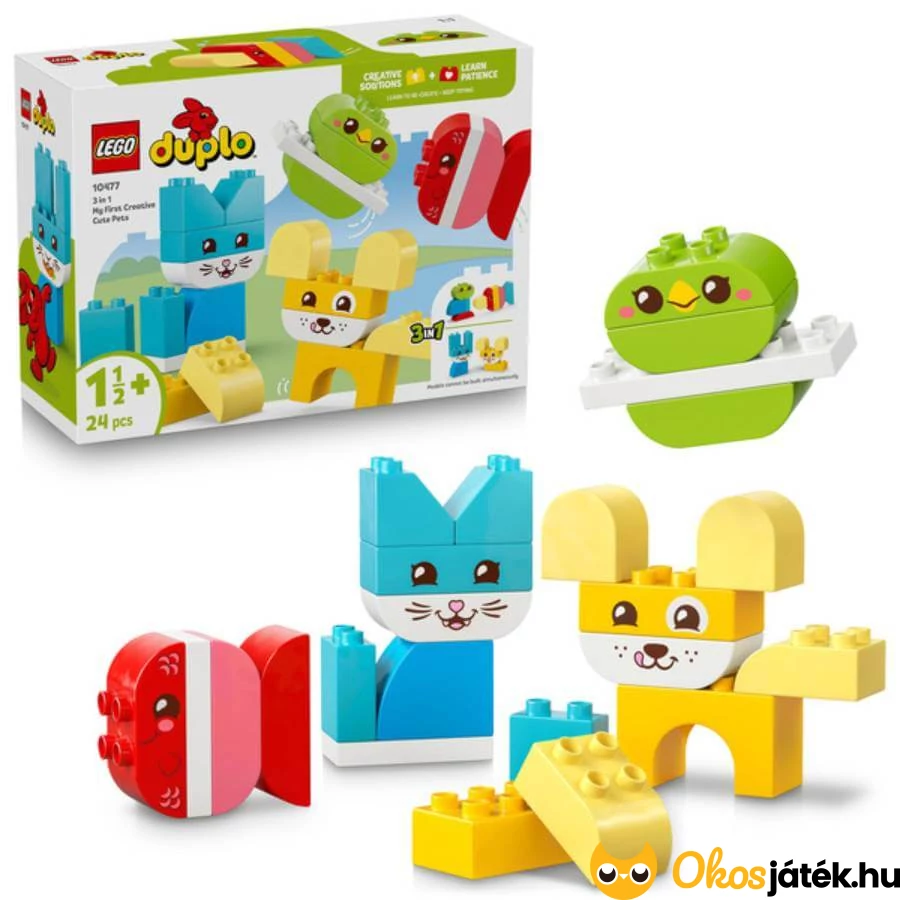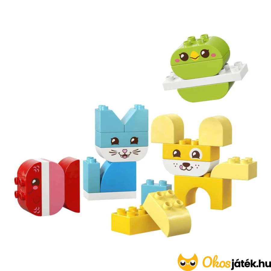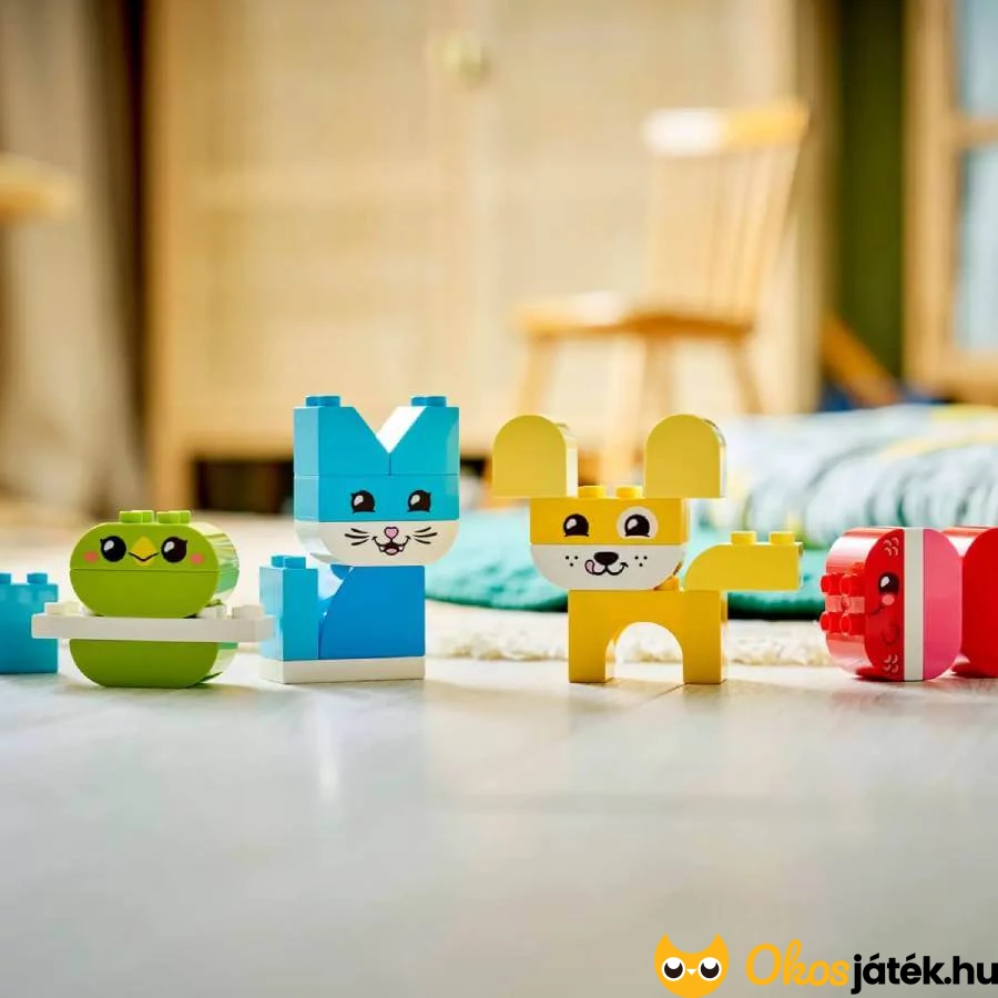 A LEGO Duplo Házi kedvencek készlet vidám, színes játékélményt kínál már 18 hónapos kortól. A 24 nagyméretű, könnyen megfogható elemből a gyerekek többféle kedves állatkát építhetnek: kutyát, cicát, madarat, nyuszit, egeret vagy akár halacskát is.